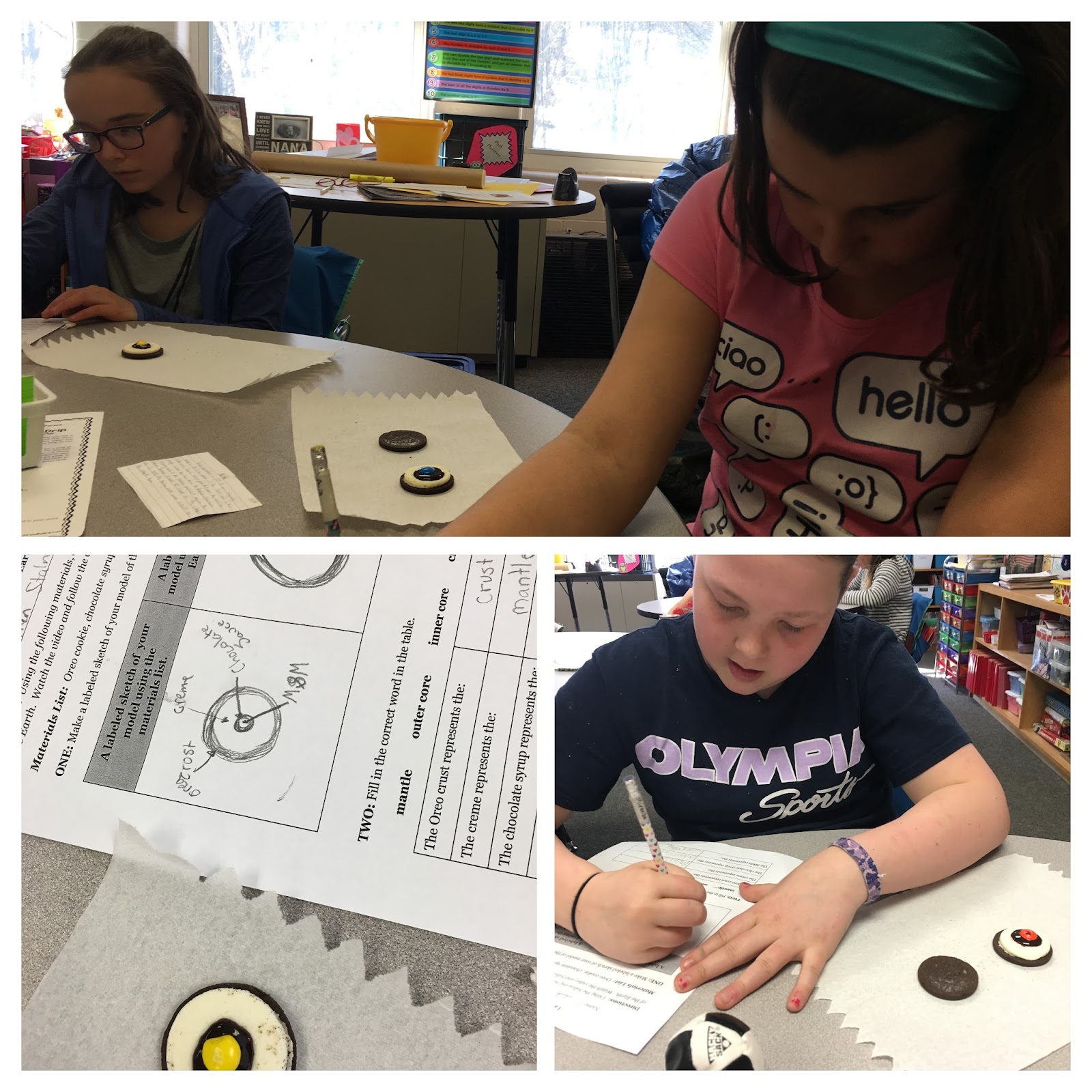 After completing our water cycle study we moved on to looking at the layers of the Earth. Students identified the crust, mantle, outer core, and inner core with the help of an oreo, chocolate sauce, and an M&M.